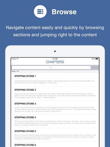 The Stepping Stones app features a deck of beautifully designed cards that include motivational quotes and advice on how to achieve your dreams. Map out your path to reach success in your professional and personal life by following these simple, small steps.