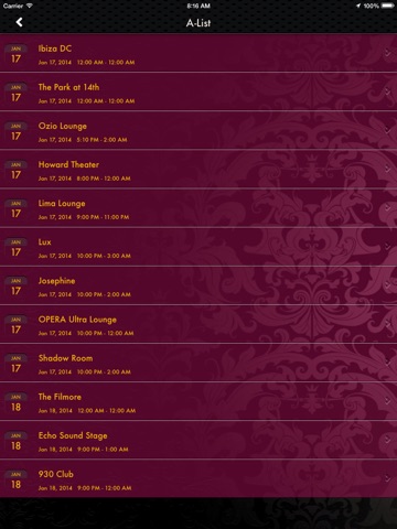 A-List is your tool for it all!!! Here you will find variety of clubs (pop, hip-hop, salsa, tech etc.), lounges (hookah, jazz etc.) and bars (sports, hookah etc.). A-List offers all the info on the HOTTEST spots in your town. This app will definitely help you find the right atmosphere regardless of your preference and the time or day of the week. A-List has everything you need at your fingertip for an unforgettable time