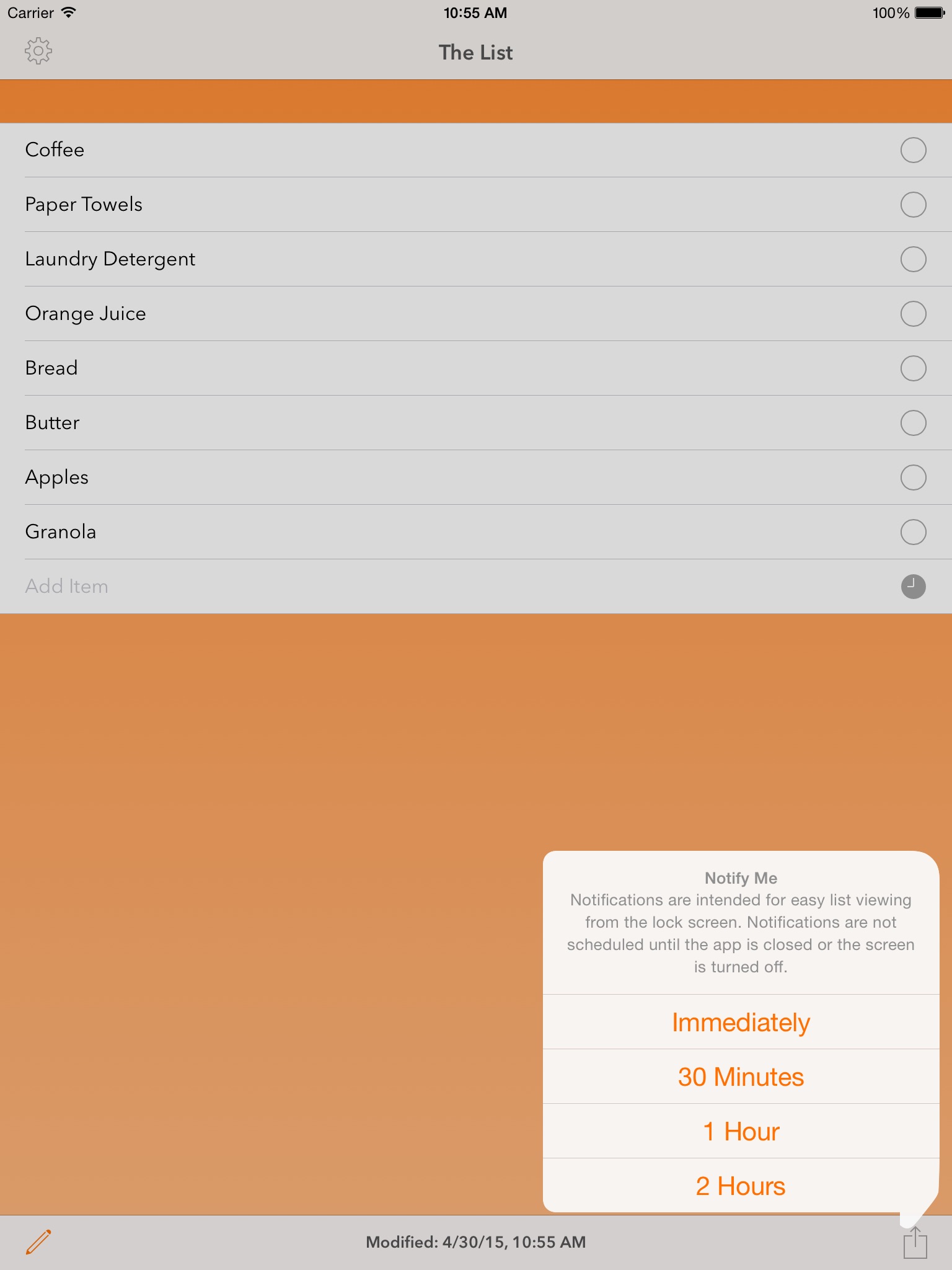 The List aims to make grocery lists simple, quick, and easy. No clutter or complicated features. Just the list, front and center, with fast entry, removal, and viewing. Here are some key features:
