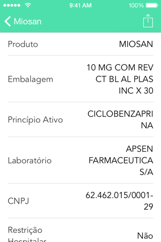 Uma vez selecionado um medicamento, as informações serão mostradas assim como na lista original. De lá, as informações podem ser exportadas por e-mail ou copiadas.