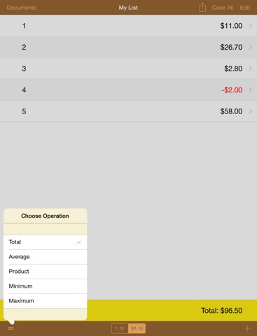 ListCalc can calculate the total, average, product, minimum value, or maximum value of the list.