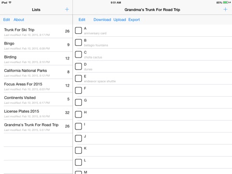Multiple lists can be maintained with any number of items. Items can have a title and a body, and be toggled between active and completed. Done items can be cleared. Supports all iOS devices.