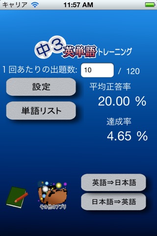 You can learn Japanese vocabulary very easily and enjoyably by playing this application. [ This version contains words taught in the 8th graders in japan.] This application create some quiz of translation between English and Japanese. All you have to do is pick the correct answer from the multiple selection and press "Answer". Your answers would be automatically stored in a database inside the App and your average score for each words would be calculated. The achievement rate and the average score will be automatically calculated as well. So you can easily know how much you studied. The achievement rate would be send to the game center leaderboard so you can compete your knowledge with your friends. By clicking the "Show Words List" button in the top page, you can review your scores anytime you want . In this mode you can search words by entering keywords in the search tab. You can also search words with correct rate or the number of times the word was set. [Enter "%>10" in the search bar to search for words that has the correct rate over 10%. Enter "C>10" in the search bar to search for words that has been set for more than 10 times. If you want to search words that was set or has the correct rate under 10% you just have to change ">" to "<" if you want to search for other percentage(or number of times), just change the "10" to the number you like.] In the "Settings" mode, you can restrict the quiz to show only the words that has bad correct rates or low number of times.
