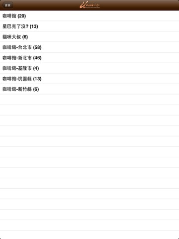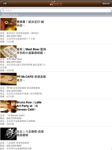 咖啡館:以條列方式呈現各地咖啡館,讓使用者一目了然,還可輸入關鍵字查到想要的店家。詳細內容中有美麗的圖文,並可做行車導航,撥打電話與Facebook分享。