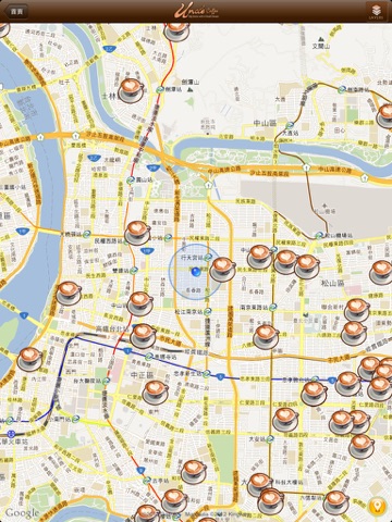 咖啡館地圖:使用者透過Google地圖與GPS定位,在地圖上觀看附近所有咖啡店家位置,並可直接打電話訂位,或觀看文章詳情。