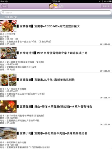 文章列表:以條列方式呈現各類美食分類, 讓使用者一目了然, 還可輸入關鍵字查到想要的店家。詳細內容中有美麗的圖文, 並可做行車導航, 撥打電話與Facebook分享。