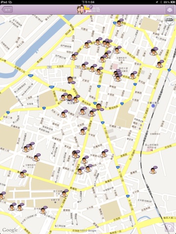 旅行地圖:使用者透過Google地圖與GPS定位,在地圖上觀看附近所有美食店家位置,並可直接打電話訂位,或觀看文章詳情。