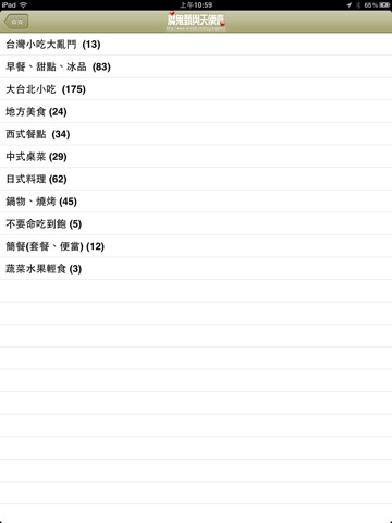 團購美食:各地團購,廠商試吃介紹。以條列方式呈現各類團購食分類, 讓使用者一目了然, 還可輸入關鍵字查到想要的商品。詳細內容中有美麗的圖文, 並可做行車導航, 撥打電話與Facebook分享。
