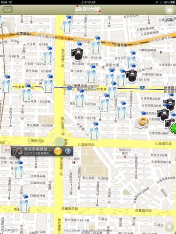 美食地圖:使用者透過Google地圖與GPS定位,在地圖上觀看附近所有美食店家位置,並可直接打電話訂位,或觀看文章詳情。