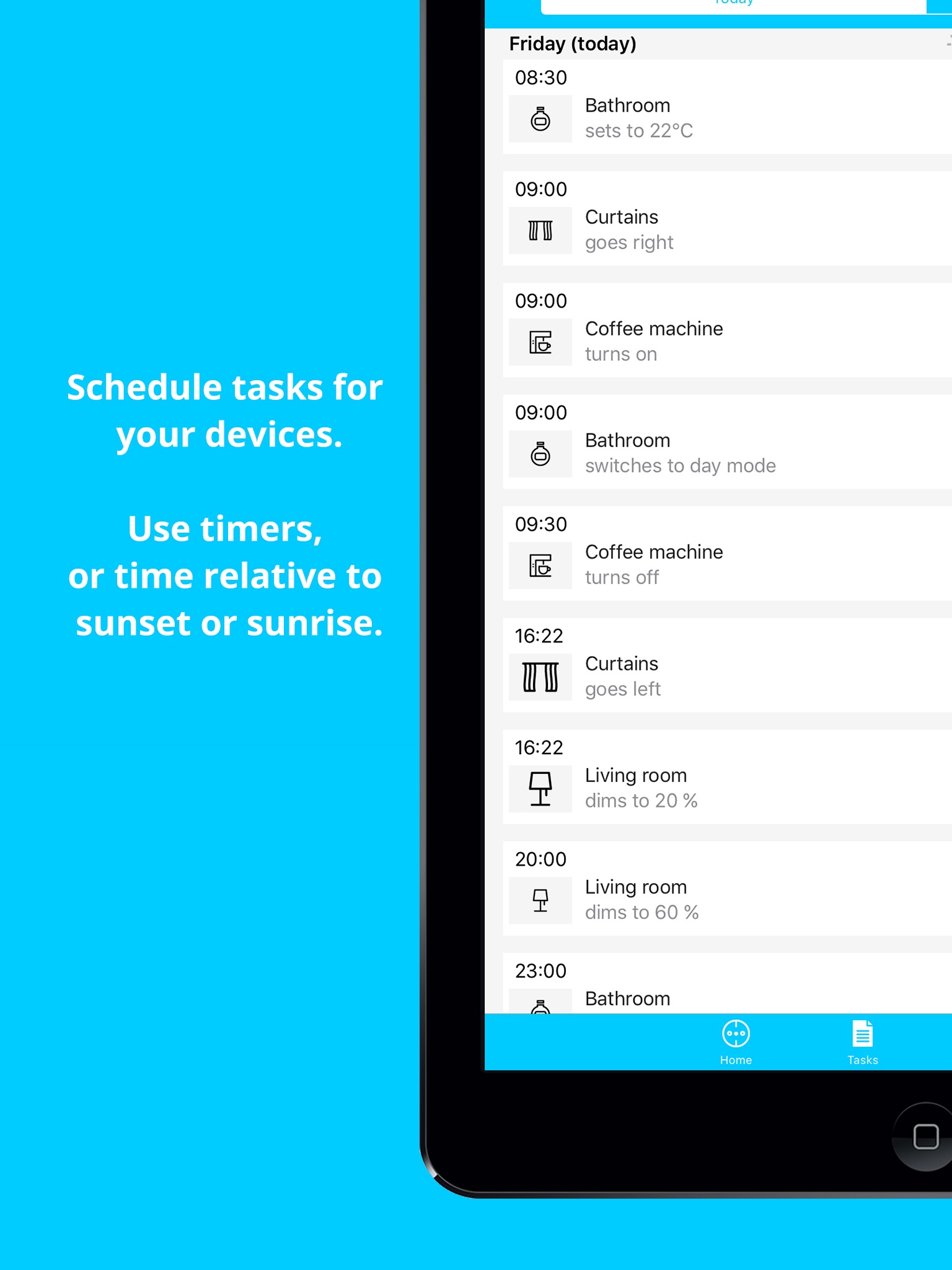 Manage the heating in different rooms with radiator valves, turn of lights while in your bed, dim lights to the perfect atmosphere or close curtains automatically when the sun goes down.