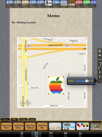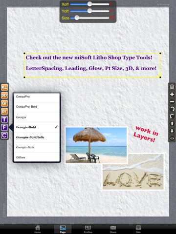 To create, select an Item and begin adding your Graphics from the App, the miSoft on-line Art Server, import Pictures or Graphics from your Gallery or Clipboard, even import Google® Maps! Re-size and rotate any Element. Layer and set Opacity/Transparency to build beautiful designs and layouts! Even enhance your work with our Amazing Photo Effects! Use the Logo Creator to build Logos, then Save for use throughout Litho Shop on any of your Print Items.