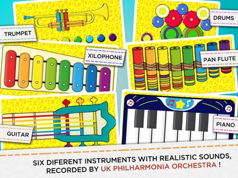 4. Six different instruments (piano, xylophone, guitar, drums, pan flute and trumpet)