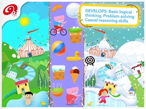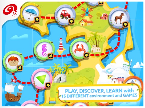 The game consists of 15 beautiful environments each focused on a set of basic concepts from the childs world such as shapes, colors, animals and objects.
