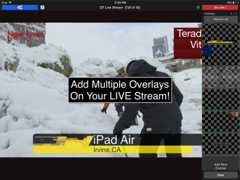 Add up to 2 graphics layers on top of your stream, including lower thirds, images, and text.