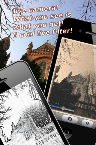 With 6 cool live filters, you can create great effect such as old photo, sketch, convex mirror, and so on.