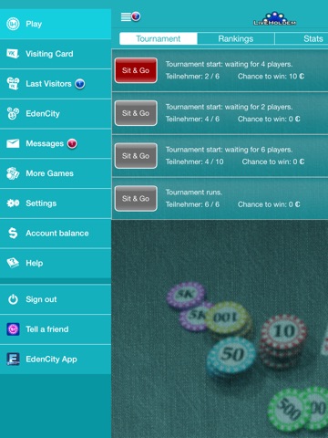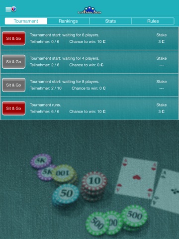 LiveHoldem is the app from the popular Poker Site LiveHoldem.de in Liveholdem you can play 24 hrs Sit & Gos and Tournaments. Also for free!