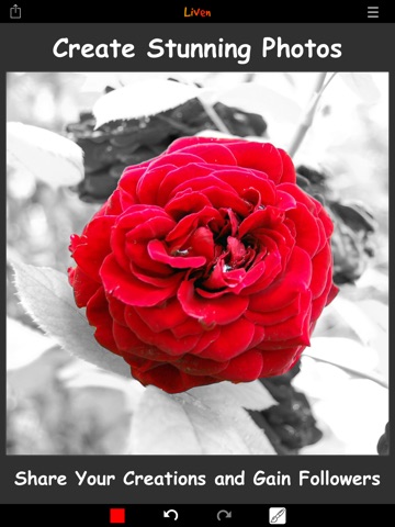 Livens intuitive interface allows you to quickly and easily give your photos the look they need to stand out for business or social networks such as Instagram, Facebook and Twitter, getting you more customers and followers. Simply load a photo and it becomes grayscale instantly - then tap and drag your finger to colorize and then share your creation.