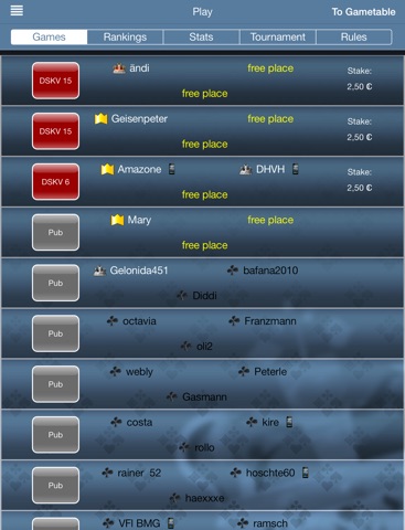 - Pub-Skat: In Pub Skat Bock & Ramsch are also played, Contra and Re can be announced. You can play Pub-Skat for free or between 0.5 - 2 cents per point.