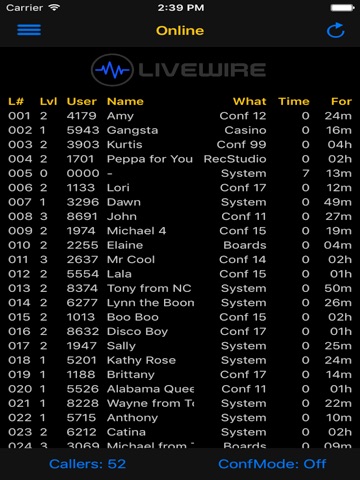 This application displays who is currently on Livewire. A completely free telephone entertainment system offering: live chat, voice mailboxes, bulletin boards and more!