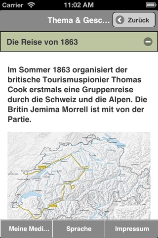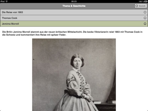 The historical facts of this journey have been adapted into the drama “Rendezvous with an Englishwoman”, a time-travel video guide for tourists. The drama centres around the actual historical figure of Jemima Morrell and her fictitious contemporary Kaspar Brunner, an historian. The dialogue between the two protagonists takes today’s tourists on a journey back more than century to experience the Switzerland of 1863 and the beginnings of organised group tourism, through the perspective of an adventurous Victorian with a real lust for life.