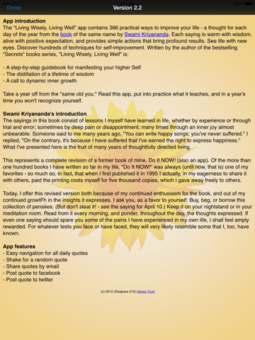 The "Living Wisely, Living Well" app contains 366 practical ways to improve your life - a thought for each day of the year from the book of the same name by Swami Kriyananda. Each saying is warm with wisdom, alive with positive expectation, and provides simple actions that bring profound results. See life with new eyes. Discover hundreds of techniques for self-improvement. Written by the author of the bestselling "Secrets" books series, "Living Wisely, Living Well" is: