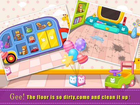 Children always make a mess of things in the living room!See the floor is covered with trash,slops in the coner,the toys are everywhere.Mom gets tired after cleaning up the living room,Does she work much too hard?Come and learn how to help your Mom!