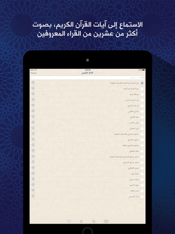 - تحميل والاستماع إلى آيات القرآن الكريم، بصوت أكثر من عشرين من القراء المعروفين، منهم: عبد الباسط عبد الصمد، عبدالله بصفر، عبد الرحمن السديس، أبو بكر الشاطري، مشاري العفاسي، سعد الغامدي، محمود الحصري، محمد صديق المنشاوي، سعود الشريم، ياسر الدوسري