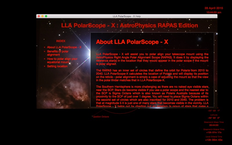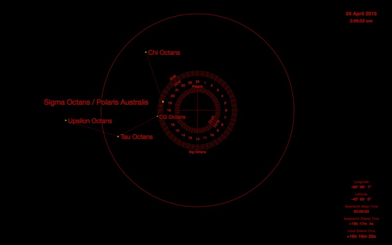 For southern hemisphere users this app will generate the Octans asterism which will assist you to identify the southern polar reference star - Sigma Octans. Sigma Octans is about magnitude 5.3 which makes it hard to identify on its own but when you can see it in relation to the other nearby stars the task becomes easier.