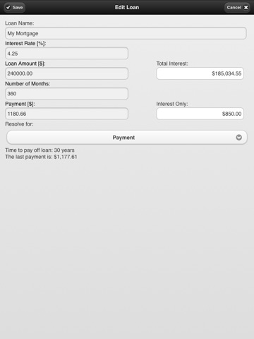 This free financial calculator computes loan payment given principal, interest rate and loan term (length). You can calculate any loan variable given the other three. That is useful in finding the monthly payment, APR, interest-only payment, total interest paid, or the effects of principal prepayment.