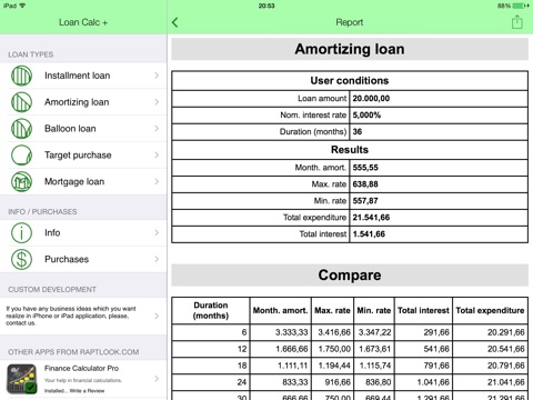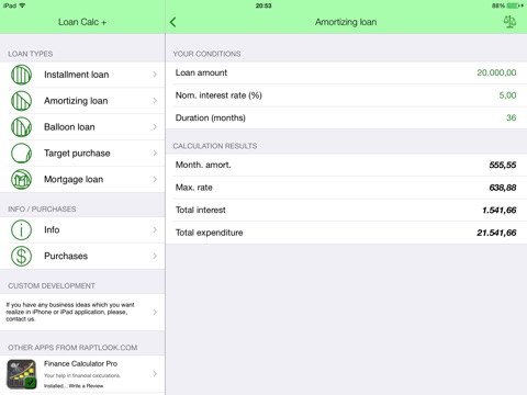 Das App benutze ich um meinen hypothekenkredit auszurechnen inkl. Angabe von Sondertilgung, aber es kann noch mehr. Man kann sich eine Tabelle anzeigen lassen mit verschiedenen Tilgungsraten. Echt gut. Was fehlt ist eine Sondertilgung in einem bestimmten Jahr.