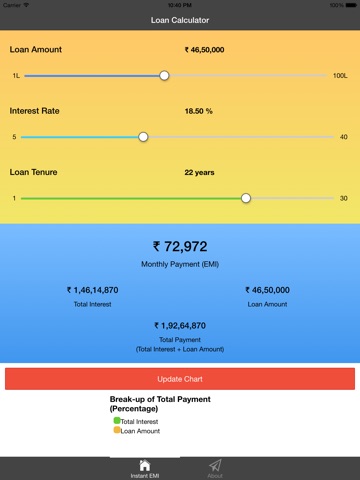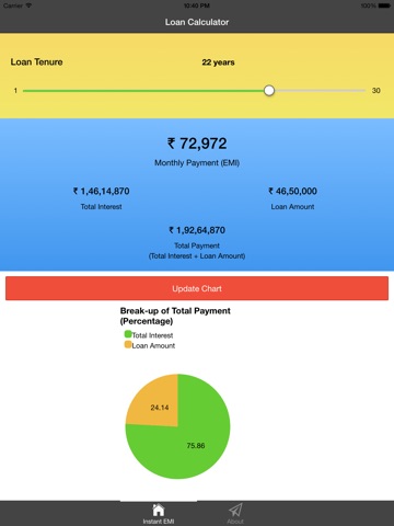 Loan EMI Instant Calculator is simple and easy to use app that allows you to calculate the Loan EMI (Equated Monthly Installment) payment instantly. You can calculate EMI for home loan, car loan, personal loan, education loan or any other fully amortizing loan using this calculator.