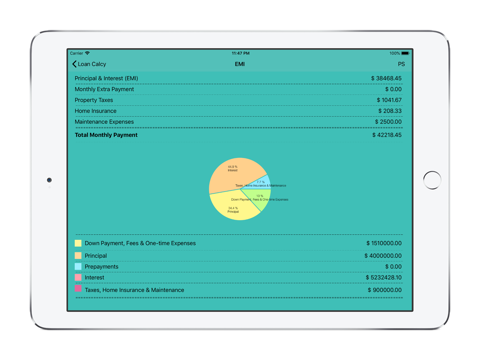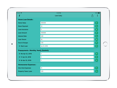 LoanCalcy app is an advanced calculator that helps you to calculate the EMI, monthly interest and monthly reducing the balance on the basis of principal amount, loan tenure and interest rate. To calculate EMI, tax and extra payments info, you need to do is enter the required information with minimum user interaction.