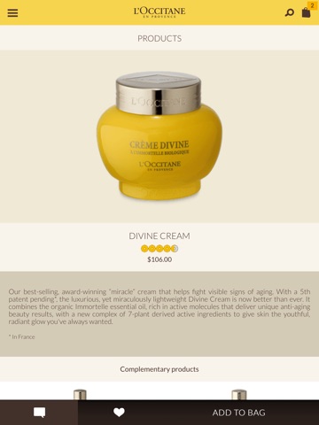 Alors là cest le pompon ! Comment une société telle que lOccitane, dont lagencement des magasins est toujours savamment étudié, au marketing impeccable, a pu faire une telle horreur ??!? Ergonomie nullissime, les boutons se chevauchent, les titres ne sont pas centrés, les images sont cheap, on a limpression dêtre dans un site mobile avec des boutons standards et dune laideur sans nom... Je mattendais à une application qui respire la Provence, et bien pas du tout !