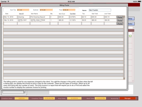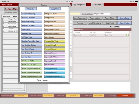 This is the third generation of the lodging management Pro application over the last 13 years. The 3.0 version is a major revision that added a number of new advanced features. Features like the app navigation drop-down list that allows you to navigate anywhere in the application with one tap. Another feature is the consolidation of six screens within the booking and billing screen using popovers to allow the user to add records from one screen without having to navigate to the individual screens. The saves a great deal of time, and allows you to edit or review information all in one screen.