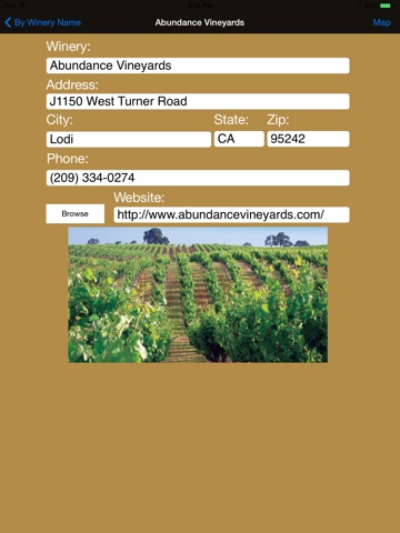 In addition, our application provides a mapping function which uses the selected winery address. The mapping function is very helpful in allowing the user to find any winery in an unfamiliar part of Lodi Central Valley, California.