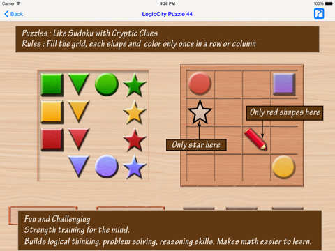 The puzzles go from simple to really hard, and can be fun for the hobbyist or the serious puzzle lover. Work your way through them from the start, and youll be amazed at what you can do. Too easy to start with? Jump to the later levels straight. You get to choose!