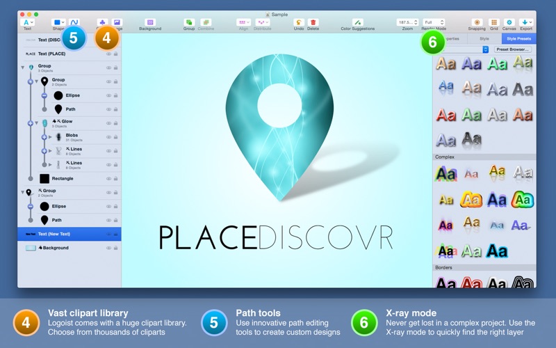 From simple logos, banners, icons, postcards, and buttons to complex vector art- Logoist 2 for Mac helps you create impressive illustrations and images. With its advanced layers, groups, and beautiful effects and filters there is no limit to your creativity. Create images from any shape or path, or use the large clip art gallery. Logoist 2 is the ideal tool to translate your ideas into images.