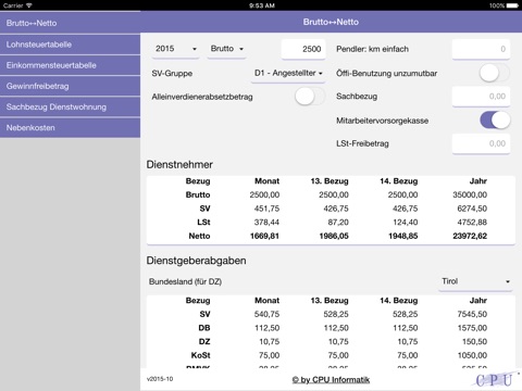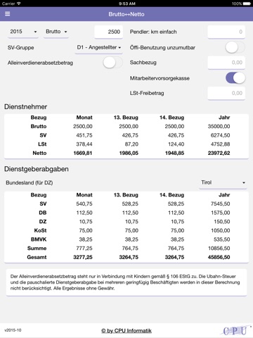 Erforderlich ist die Eingabe der täglichen/monatlichen Lohnsteuerbemessungsgrundlage. Das Ergebnis wird sowohl für Alleinverdiener als auch ohne Alleinverdiener ausgegeben. Die Berechnung ist sowohl für aktive Dienstnehmer als auch für Pensionisten vorgesehen, für erstere wird auch der Pendereuro berücksichtigt.