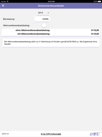 Erforderlich ist die Eingabe der jährlichen Einkommensteuerbemessungsgrundlage. Das Ergebnis wird sowohl für Alleinverdiener als auch ohne Alleinverdiener ausgegeben.