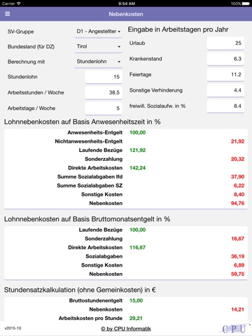 Der Rechner berechnet die Lohnnebenkosten für Österreich. Es werden die Lohnnebenkosten sowohl auf Basis der Anwesenheitszeit, als auch auf Basis des Bruttomonatsgehalts ermittelt, sowie die Arbeitskosten pro Stunde zur Durchführung einer Stundensatzkalkulation.