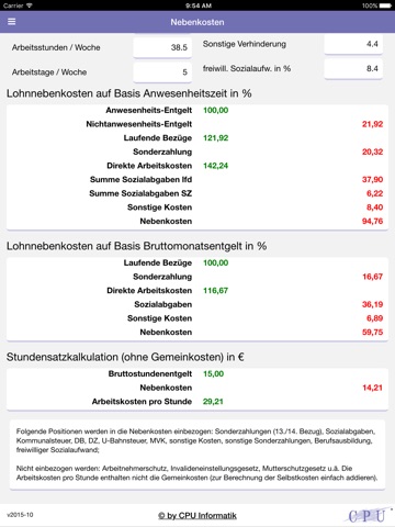 Nicht berücksichtigt werden: Arbeitnehmerschutz, Invalideneinstellungsgesetz, Mutterschutzgesetz u.ä. Die Arbeitskosten pro Stunde enthalten nicht die Gemeinkosten (zur Berechnung der Selbstkosten einfach addieren).
