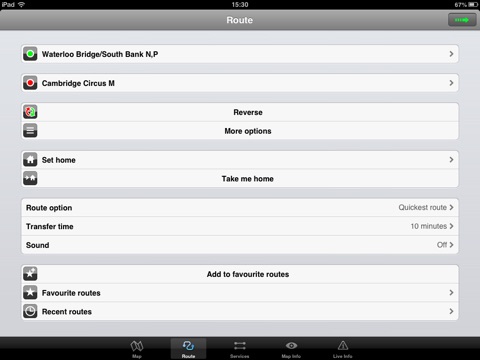 When an internet connection is available, optional "Live Information" on the current state of the transport services can be viewed allowing you to plan your journeys in advance and avoid any potential delays. Unique to this application is the ability to turn off services that are out of action and automatically calculate an alternative route.