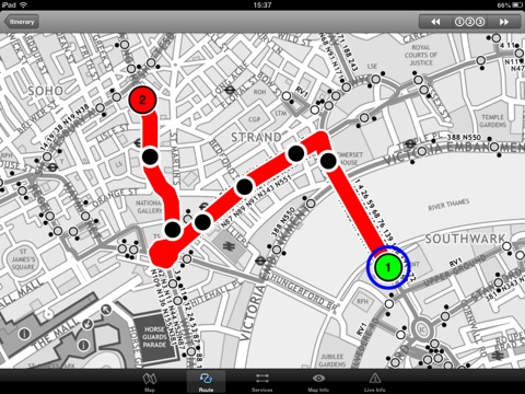 The new London bus application makes it easy to travel in and around the city by bus. Unlike old fashioned schematic style maps this product contains a geographically accurate map showing streets, parks and places of interest etc.