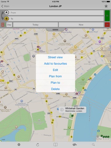 ► Select journey end points by text search (station names, points of interest, post codes etc.), selecting markers/pins on the map, choose your current location or a saved favourite place.