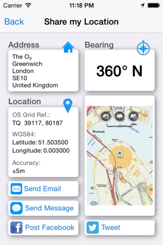 - "Share My Location" allowing users to share an image of their current location and location references. Buttons are provided to share location information by Facebook, Twitter, iMessage/SMS and e-mail
