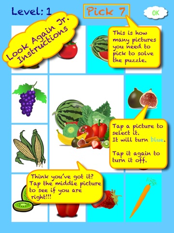 Educators of children ages 3 to 8 know the importance of teaching young learners to group objects by categories. Look Again Jr. trains children to organize information while having fun. The app presents the child with a series of puzzles consisting of sets of pictures; to solve each one the child must work out the relationship between the pictures, and select the ones that correctly fit into the group by matching colors, counting, or seeing what the pictures have in common. The wide variety of puzzles and music keeps kids engaged and focused while learning.