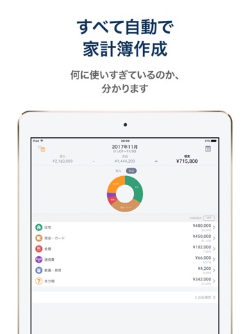 支出は費目別に自動でグラフ化されるので、お金の流れがひと目でわかります。