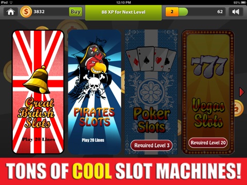 Spin to gain XP to level up! Multiple line payouts and unlockable slots.