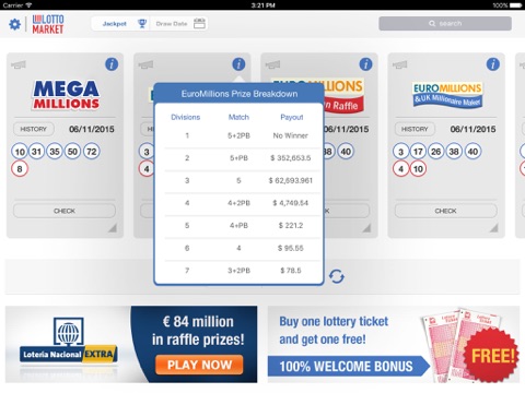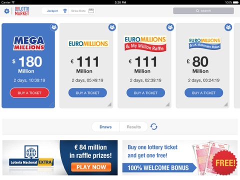 Download the Lotto Market iPad app and youll receive all the latest lottery results and online lottery ticket information. Find out the latest winning numbers and current jackpots for the worlds most popular lotto games: US Powerball, EuroMillions, US Mega Millions, EuroJackpot, SuperEnalotto, La Primitiva, Australia Powerball Lotto, Oz Lotto and many more…