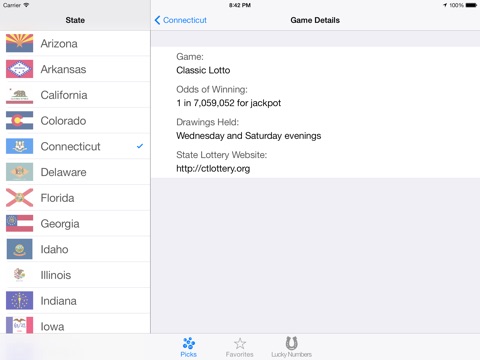 Lotto QuickPick allows you to pick random numbers for all the lottery games in your state or territory. If you dont like the numbers, pick again until you are satisfied. Lotto QuickPick will draw numbers for all the games in your selected area for all states that have lottery programs (also includes US Virgin Islands and Puerto Rico). Best of all you can share your results with friends and also look at specific game details such as odds of winning the jackpot or your local lottery website.